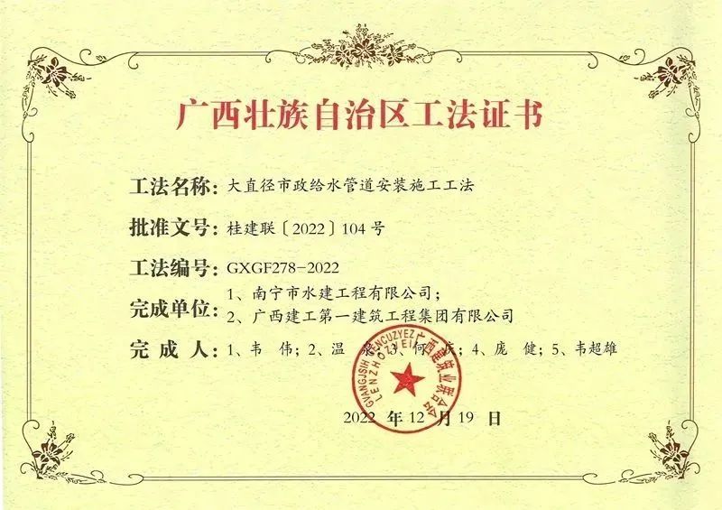 在2022年度廣西壯族自治區級工程建設工法評審活動中,由廣西綠城水務股份有限公司下屬南寧市水建工程有限公司(下簡稱“水建公司”)組織申報的《大直徑市政給水管道安裝施工工法》,經自治區級工程建設工法評審委員會評審,成功獲評為2022年廣西壯族自治區級工程建設工法。
